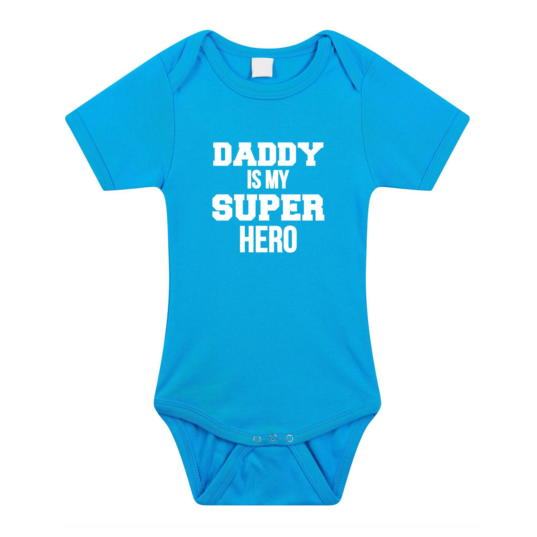 Daddy super hero geboorte cadeau / kraamcadeau romper blauw voor baby’s / jongens. Op deze blauwe romper staat in grote witte letters de tekst: Daddy is my super hero.