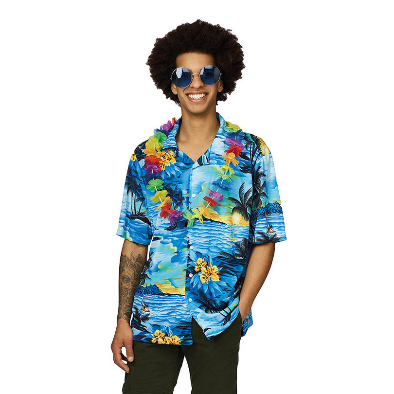 Hawaii shirt blauw me palmbomen. Tropish shirt in de kleur blauw met afbeeldingen van o.a. palmbomen. Het tropische shirt voor heren is verkrijgbaar in verschillende maten. Materiaal: 100% polyester.