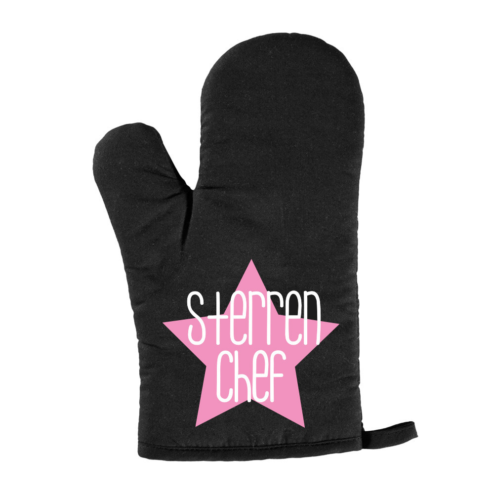 Ovenwant voor volwassenen in de kleur zwart. Op de ovenhandschoen staat de tekst: Sterren Chef, met een roze ster. Een hoogwaardige keukenhandschoen van zacht katoen met een doorgestikte zijde met ruitpatroon. De want heeft een ophanglusje bij de opening. Met deze ovenwant bescherm je je handen tijdens het barbecueen of eten uit de oven halen. Leuk om cadeau te geven voor een verjaardag of een andere gelegenheid.