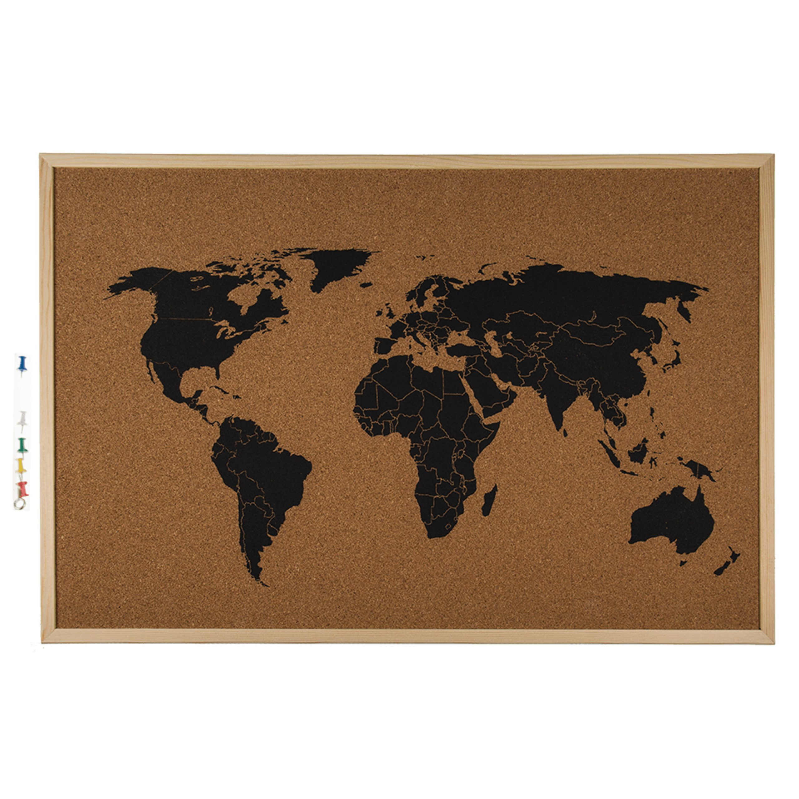 Prikbord met wereldkaart 40 x 60 cm. Kurken prikbord met houten omlijsting en zwarte wereldkaart opdruk. Formaat: ongeveer 40 x 60 cm. Reis wensen of belevenissen memos zetten. Cadeau gadget voor iedereen.
